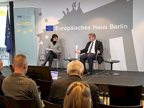Über diese und weitere Themen diskutierten wir beim IEP-Europagespräch gemeinsam mit Thomas Ossowski, Ständiger Vertreter der Bundesrepublik Deutschland bei der Europäischen Union. Die Begrüßung und Moderation übernahm Prof. Dr. Funda Tekin, Direktorin des IEP. Die Veranstaltung fand mit freundlicher Unterstützung des Auswärtigen Amts statt.
