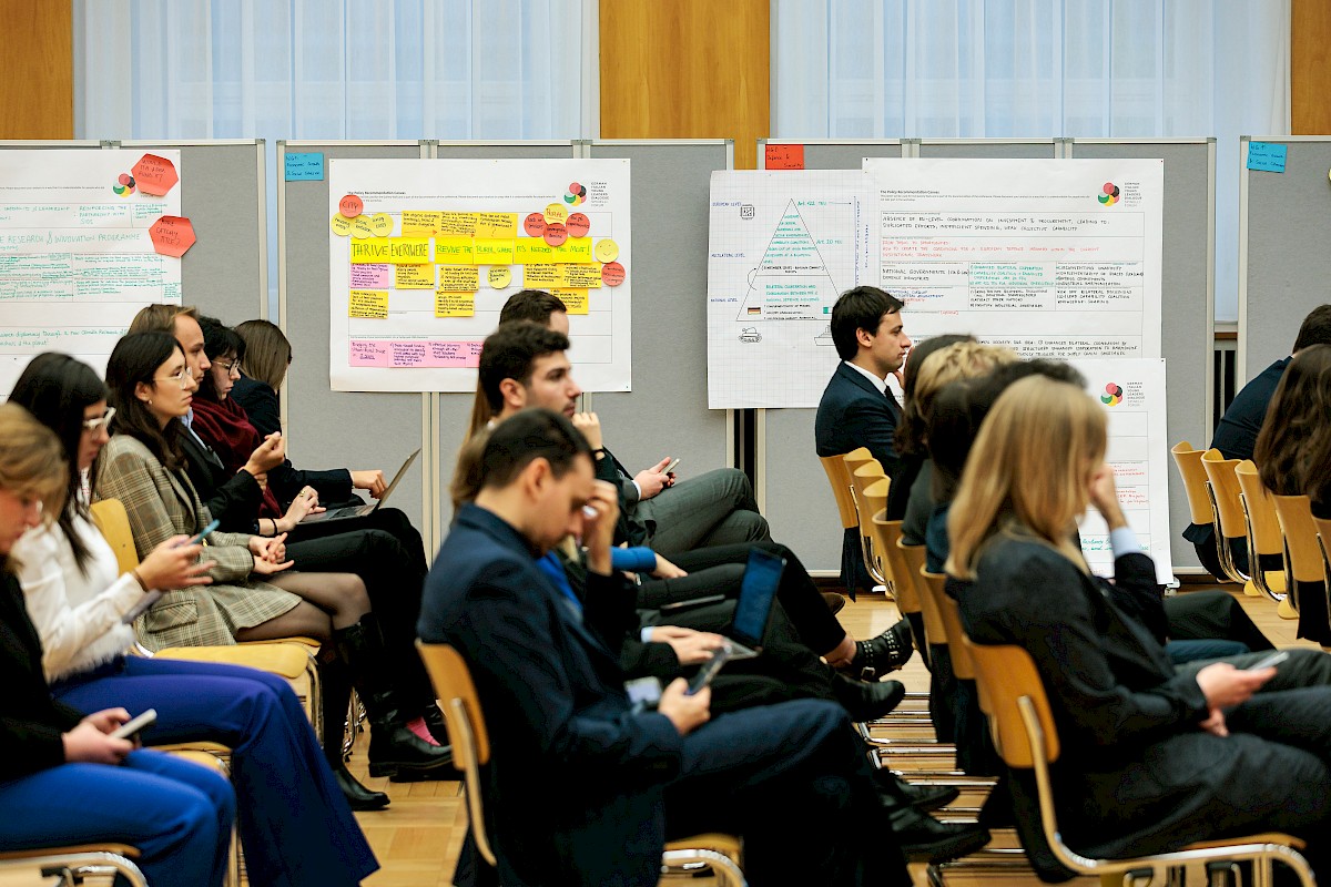 Based on the results of the online workshops, during the first day of the conference, participants refined their problem definitions and brainstormed recommendations; the day concluded with a reception at the Italian Embassy in Berlin. On the second day, the groups finalised their proposals and presented them to all participants during a Gallery Walk. In the final presentation of the policy recommendations, participants received constructive feedback from Fabrizio Bucci, Ambassador of Italy to Germany, and Christoph Wolfrum, Director-General for European Affairs at the German Federal Foreign Office. The policy recommendations will be published on the IEP website shortly.